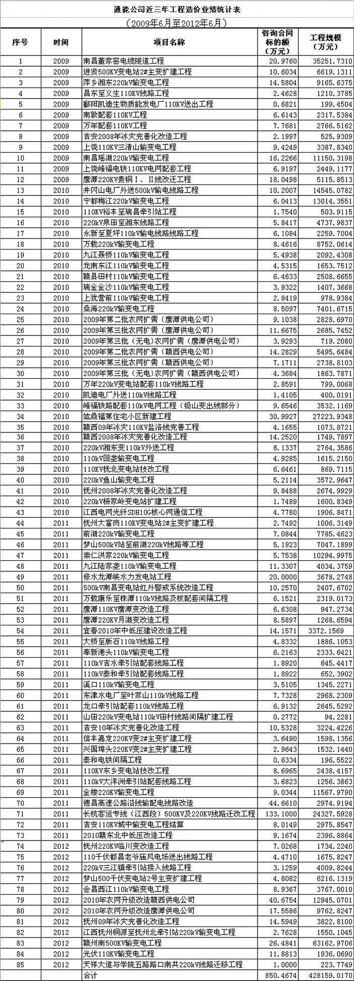 通能公司近三年工程造價(jià)業(yè)績統(tǒng)計(jì)表