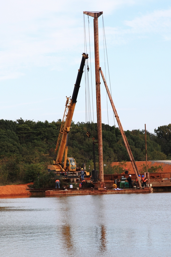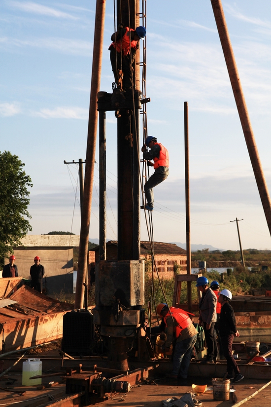 工人正在組裝打樁設(shè)備。