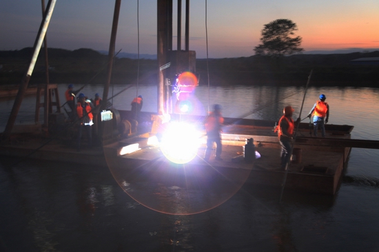 夜色中推移打樁船就位。
