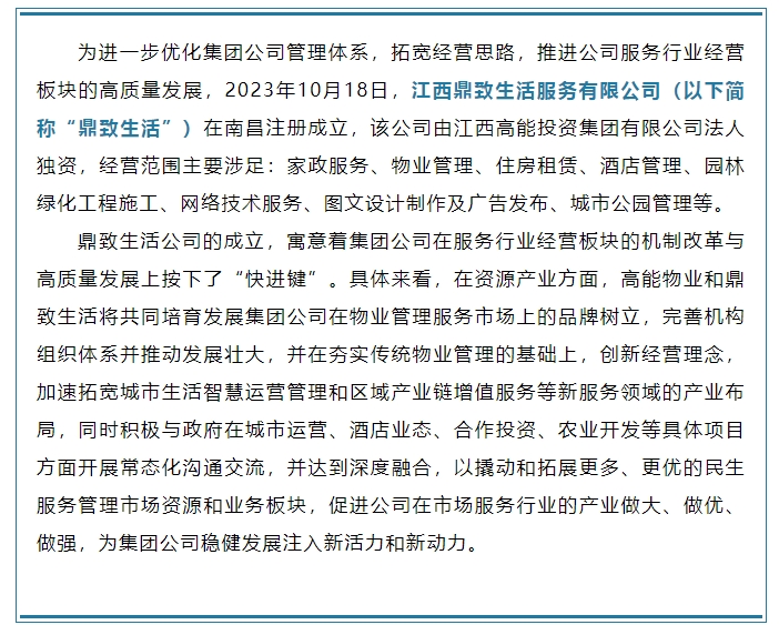 創(chuàng)新經(jīng)營理念 拓寬產(chǎn)業(yè)布局——高能集團(tuán)在昌注冊成立“江西鼎致生活服務(wù)有限公司”