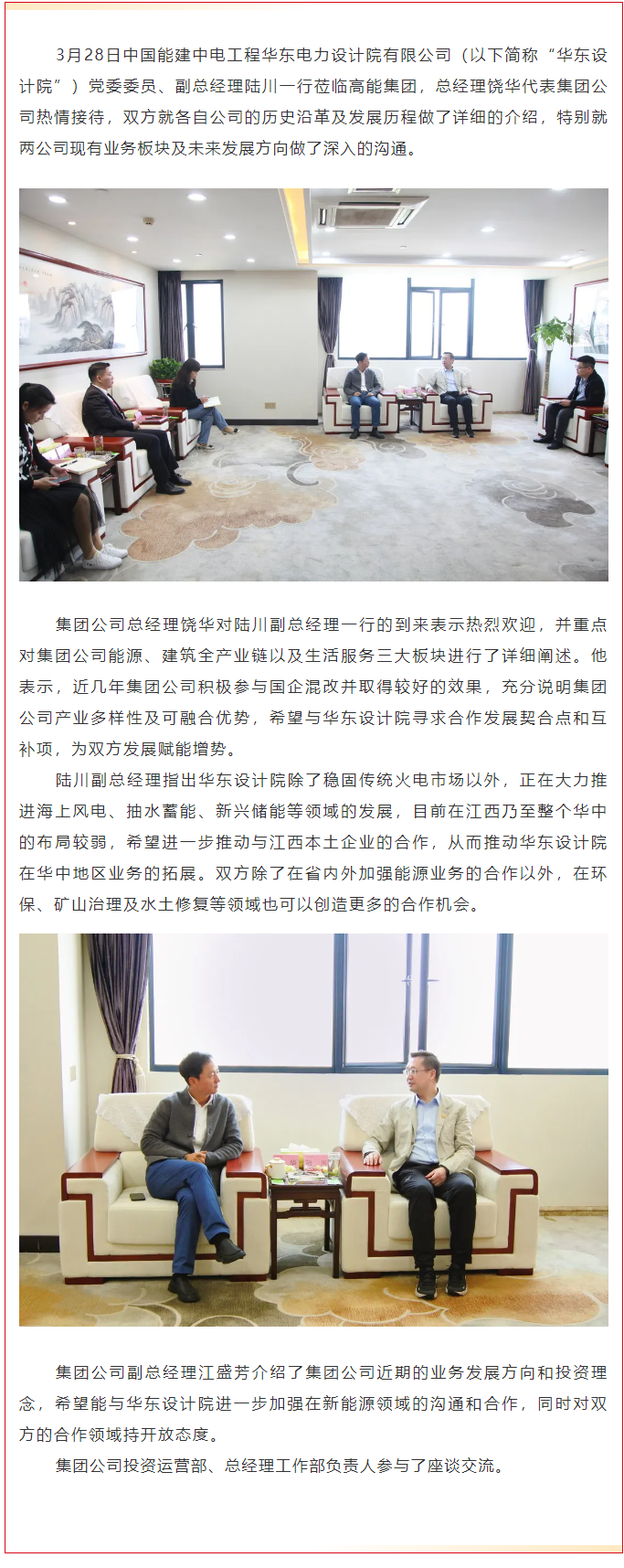 中國能建中電工程華東電力設(shè)計院有限公司黨委委員、副總經(jīng)理陸川一行蒞臨高能集團座談交流